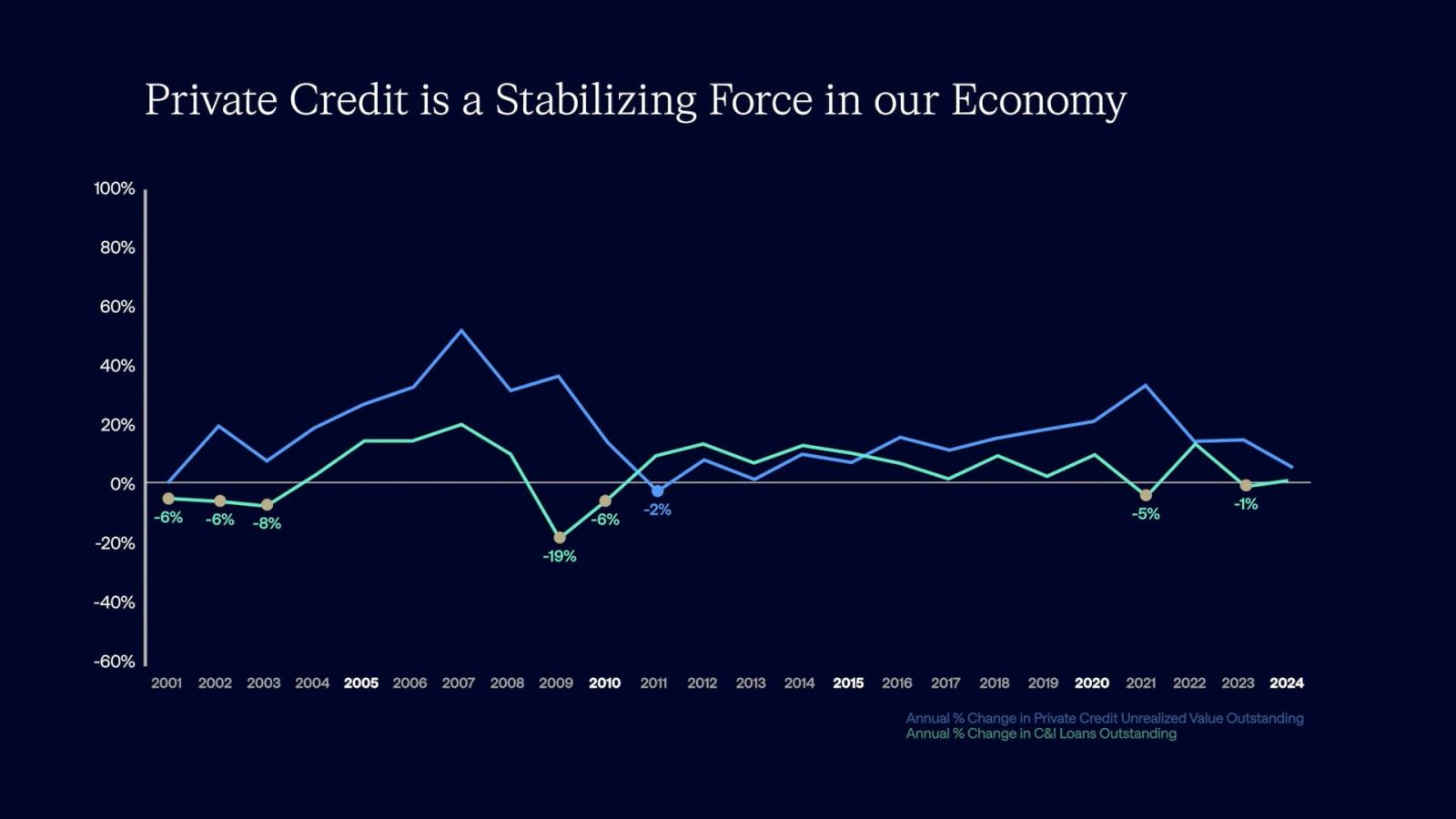 It took time, but BDCs changed the market. On the demand side, they gave small and midsized businesses access to liquidity that they needed to grow. On the supply side, for the first time ever, BDCs as a financial product—publicly traded, regulated, closed-end direct-lending funds—allowed individual investors access to a dynamic private credit market that offered diversification from publicly traded stocks and bonds.